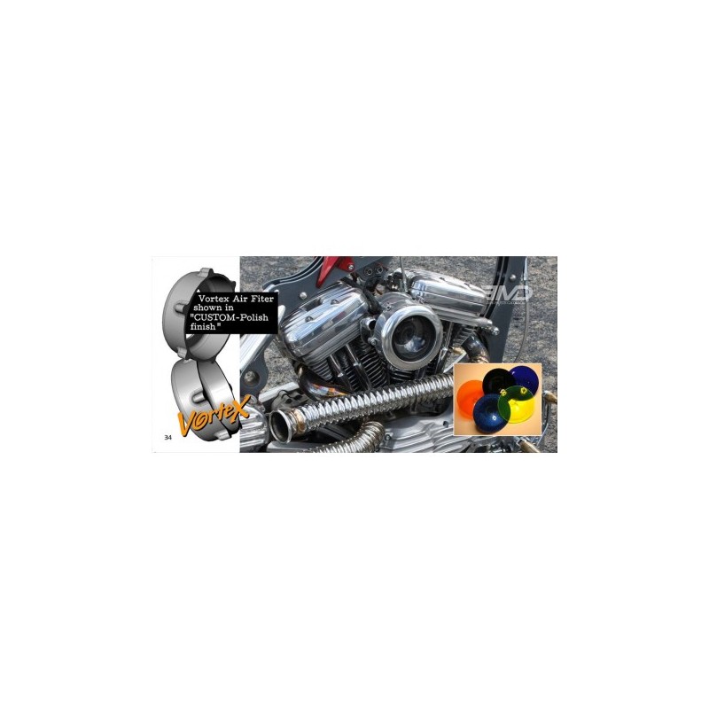 Le Filtre a Air EMD / VORTEX «Racing» s’installera parfaitement sur tous modeles de Machine de 1986 a 2015 dotés d’un Carburateur CV ou a Injection jusqu'à 96 CI en apportant une touche «Performance» indéniable .