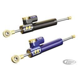 De plus en plus de pilotes Harley aiment améliorer les performances de leur moto et les conduire à des vitesses plus élevées. Mais les Harley-Davidson ne sont pas conçues pour une utilisation à grande vitesse. Habituellement le guidonnage est causé par l'instabilité de la direction. L'amortisseur de direction Hyperpro améliorera considérablement la stabilité de votre moto. Fortement recommandé pour toutes les motos hautes performances et obligatoire pour la course. Ils sont fièrement fabriqués aux Pays-Bas et disposent d'un amortissement linéaire réglable en 22 étapes. Amortisseurs de direction et supports sont vendus séparément. Des kits de support prêts à installer sont disponibles pour certains modèles. Pour les autres applications, il est fortement conseillé de faire installer l'amortisseur de direction par un mécanicien qualifié à l'aide des colliers individuels de cadre, de fourche et de tube d'amortisseur. Un amortisseur de direction à course de 140mm fonctionne dans la plupart des montages personnalisés.