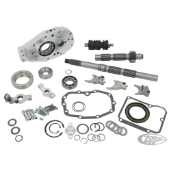 Les derniers gros pneus ont dépassé les limites acceptables concernant les déports de primaire. Le kit de déport de 55mm est réellement la limite maximale à ne pas dépasser. Pour conserver un bon équilibre de la moto qui est équippée d'un pneu de 330 il vaut mieux laisser le carter primaire dans sa position d'origine et passer la transmission finale côté droit. Avant il fallait obligatoirement acheter un boite de vitesse complète ce qui rendait la transformation assez couteuse. Quand Zodiac a commencé à développer un kit conversion pour pneu de 330 dans le cadre d'origine de Twin Cam Softail nous avons aussi trouvé un solution moins couteuse. Ceci nous a conduit à proposer deux solutions, le kit de conversion qui réutilise le plus possible de pièces d'origine et le kit de construction. Le kit de conversion est pour modèles de 1994 au présent et comprend toutes les pièces nécessaires pour convertir une boite de vitesse d'origine en boite de vitesse sortie à droite. Il comprend des pièces comme arbres primaire et secondaire, barrillet et fourchettes, trappe de boite spéciale pour le pignon principal. Pour rendre la boite de vitesse plus solide, le pignon de 5ème de l'arbre secondaire est maintenant partie intégrante de l'arbre, tous les autres pignons sont comme ceux d'origine de 1994 au présent. La visserie est également comprise avec tous les joints. "Le kit de conversion boite sortie à droite le plus économique et de super qualité". Comme certaines personnes ne désirent pas réutiliser d'anciens pignons nous prposons aussi les kit de construction qui contient tous les pignons et arbres installés sur la trappe de boite. Les kist de conversion existent pour pneu de 300 et 330 et peuvent être utilisés sur des carters stock et aftermarket d'Evolution Softail, Evolution Dyna, Evolution FLH/FLT, Twin Cam Softail, Twin Cam Dyna et Twin Cam FLH/FLT. Les kits 300 utilisent la poulie de sortie de boite d'origine. Les kits 330 sont livrés complet avec leur poulie spéciale. Tous les kits de conversion et construction utilisent un carter d'embrayage/poulie spécial qui existe séparément. Ces carters se font en version à cable ou hydraulique. La version à cable utilise les cables d'origine de Big Twin, la version hydraulique nécessite l'utilisation d'un maitre cylindre diamètre 11/16". Nous avons des maitre cylindre style origine ou custom disponible, regardez à la section commandes au guidon.