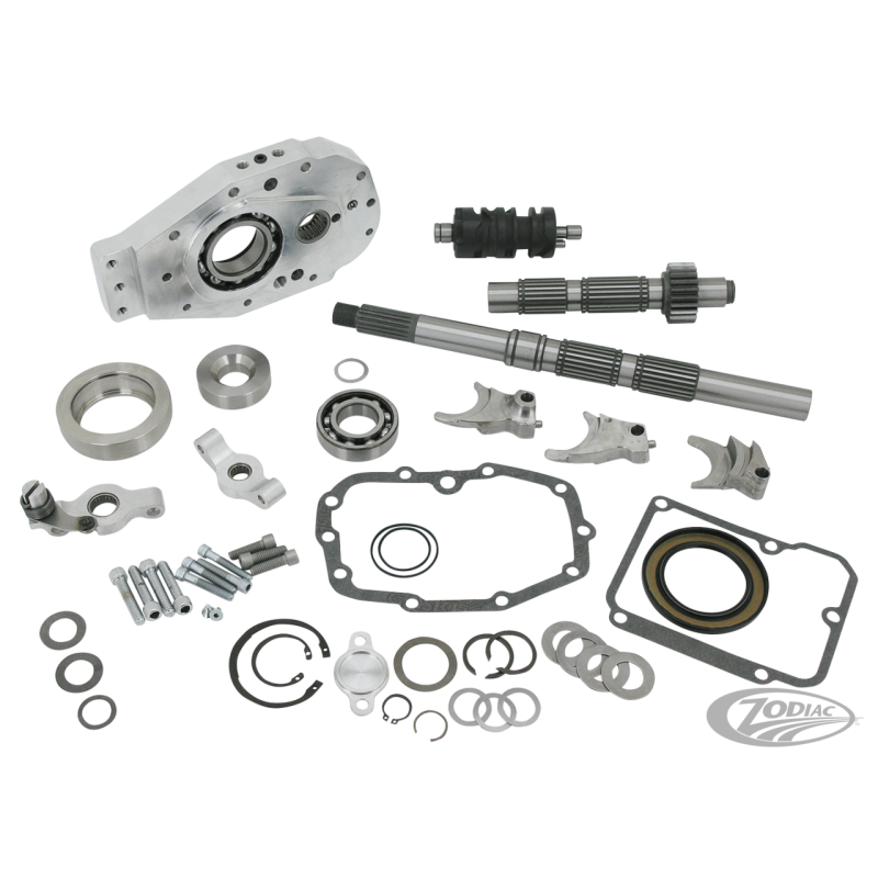 Les derniers gros pneus ont dépassé les limites acceptables concernant les déports de primaire. Le kit de déport de 55mm est réellement la limite maximale à ne pas dépasser. Pour conserver un bon équilibre de la moto qui est équippée d'un pneu de 330 il vaut mieux laisser le carter primaire dans sa position d'origine et passer la transmission finale côté droit. Avant il fallait obligatoirement acheter un boite de vitesse complète ce qui rendait la transformation assez couteuse. Quand Zodiac a commencé à développer un kit conversion pour pneu de 330 dans le cadre d'origine de Twin Cam Softail nous avons aussi trouvé un solution moins couteuse. Ceci nous a conduit à proposer deux solutions, le kit de conversion qui réutilise le plus possible de pièces d'origine et le kit de construction. Le kit de conversion est pour modèles de 1994 au présent et comprend toutes les pièces nécessaires pour convertir une boite de vitesse d'origine en boite de vitesse sortie à droite. Il comprend des pièces comme arbres primaire et secondaire, barrillet et fourchettes, trappe de boite spéciale pour le pignon principal. Pour rendre la boite de vitesse plus solide, le pignon de 5ème de l'arbre secondaire est maintenant partie intégrante de l'arbre, tous les autres pignons sont comme ceux d'origine de 1994 au présent. La visserie est également comprise avec tous les joints. "Le kit de conversion boite sortie à droite le plus économique et de super qualité". Comme certaines personnes ne désirent pas réutiliser d'anciens pignons nous prposons aussi les kit de construction qui contient tous les pignons et arbres installés sur la trappe de boite. Les kist de conversion existent pour pneu de 300 et 330 et peuvent être utilisés sur des carters stock et aftermarket d'Evolution Softail, Evolution Dyna, Evolution FLH/FLT, Twin Cam Softail, Twin Cam Dyna et Twin Cam FLH/FLT. Les kits 300 utilisent la poulie de sortie de boite d'origine. Les kits 330 sont livrés complet avec leur poulie spéciale. Tous les kits de conversion et construction utilisent un carter d'embrayage/poulie spécial qui existe séparément. Ces carters se font en version à cable ou hydraulique. La version à cable utilise les cables d'origine de Big Twin, la version hydraulique nécessite l'utilisation d'un maitre cylindre diamètre 11/16". Nous avons des maitre cylindre style origine ou custom disponible, regardez à la section commandes au guidon.
