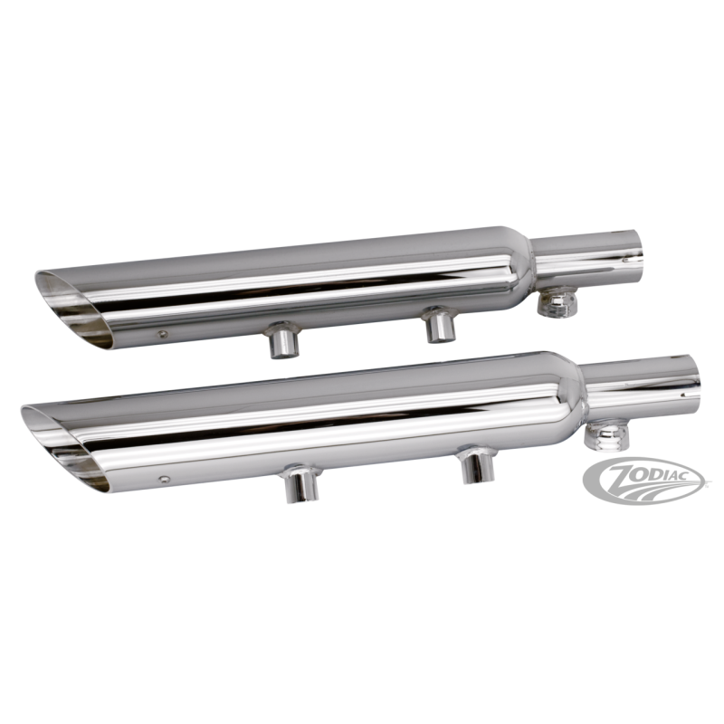 Silencieux de remplacement chromés qui glissent directement sur les collecteurs d'origine des Touring, Softail, Dyna et Sportster. Disponible en corps de silencieux seuls sans chicanes ou avec des chicanes de 1 3/4", 2" ou 2 1/2" de diamètre intérieur installées. Plus le diamètre est grand, plus le système d'échappement sera sonore. Livrés complets et se montent comme l'origine mais les colliers de silencieux doivent être commandés séparément.