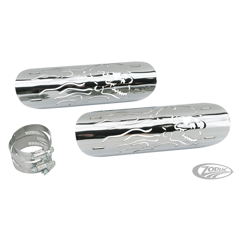 Ces jolis pare-chaleur tête de mort ont une finition chromée très belle et sont très facile à installer. La longueur totale est de 10" et ils vont sur les tubes de diamètre 2" à 2 1/4" (51 à 58mm).mm).Vendus par paire y compris les fixations.