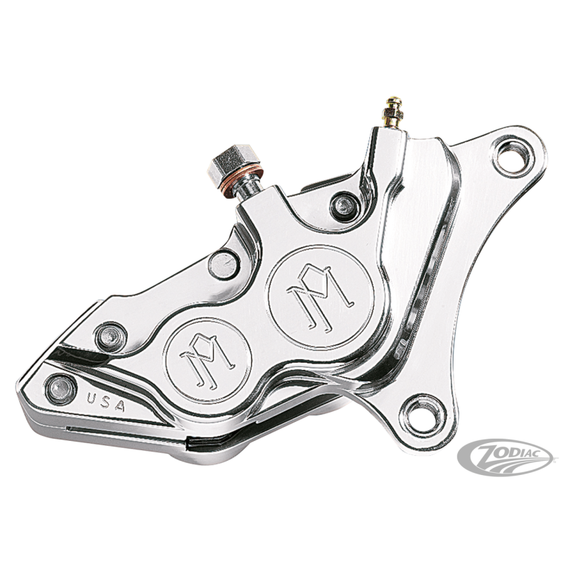 PM a conçu cet étrier spécial 4 pistons pour les 1997 et après FLSTS, FLSTSC et FLSTSB Springer Softail avec étrier à gauche et il se vissera directement sur la patte d'origine. L'autre version a une patte usinée livrée et avec l'étrier 4 pistons pour les FXSTS & FXSTB de 1988 et après avec étrier monté à droite. Les deux étriers sont faits pour être utilisés avec des disques type stock ou aftermarket de 11 1/2". N'existe qu'en simple disque.