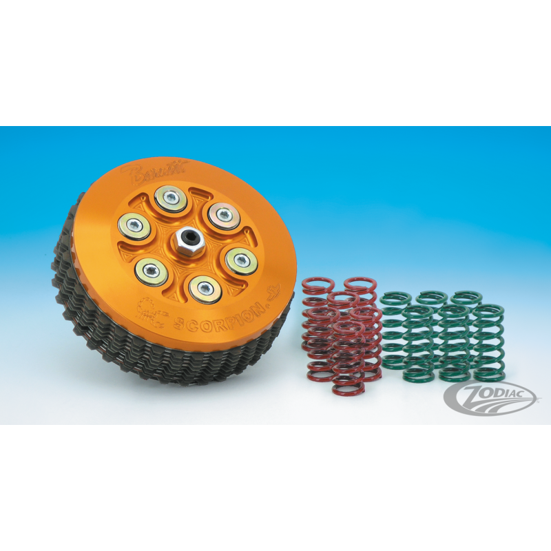 Barnett Tool & Engineering a conçu et usiné CNC en acier et aluminium comme un embrayage très hautes performances pour les Harleys. L'embrayage "Scorpion" comporte plus de deux fois plus de surface de friction que l'embrayage d'origine tout en améliorant le passage des vitesses et du point. Des plaques acier protègent de l'usure l'aluminium. L'embrayage Scorpion comporte 6 ressorts à spirales renforcés à la place du diaphragme d'origine. En plus, Barnett inclus un jeu de ressorts pour les applications racing. Vous pouvez effectuer tous les changements sans démonter le carter primaire. L'embrayage Barnett Scorpion est conçu pour un usage humide ou semi-humide avec n'importe quelle huile de primaire. Peut être monté avec des outils standards, cependant un outil spécial Scorpion est disponible séparément pour le démontage ainsi qu'une plaque de blocage pour solidariser la cloche te la noix d'embrayage.